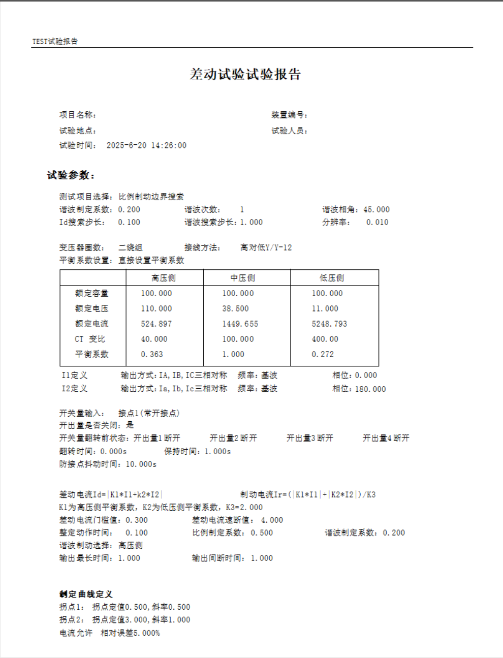 詳細記錄試驗過程中的各項數據,包括不平衡電流測試數據、比率制動特性測試數據、諧波制動特性測試數據以及動作時間測試數據